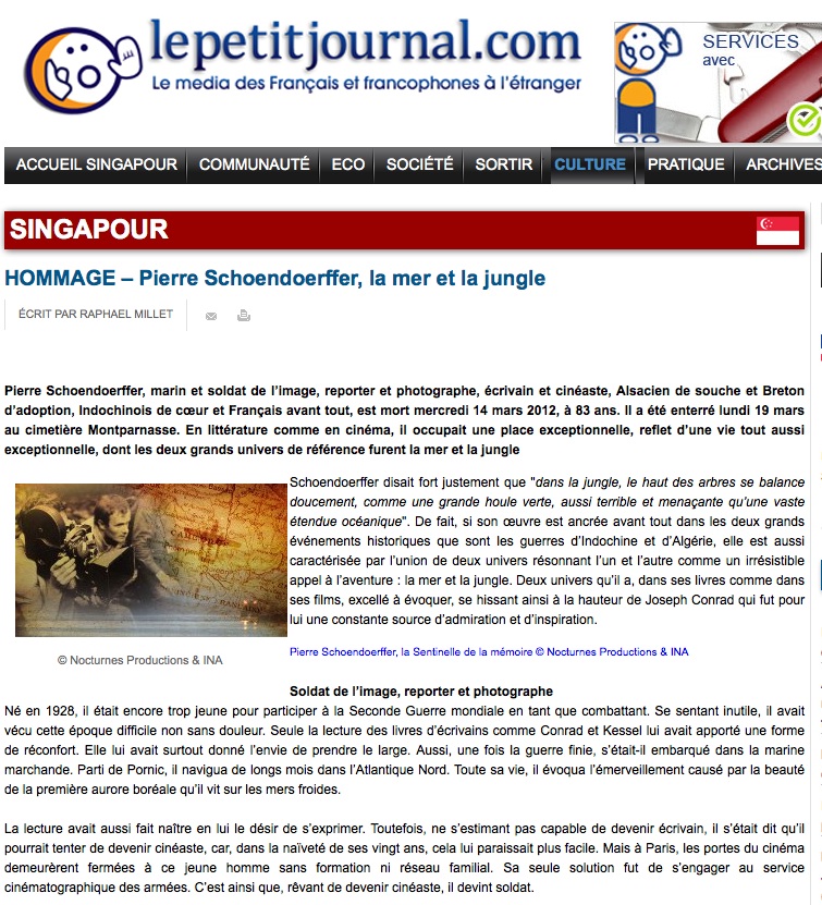 En outre, un hommage à Pierre Schoendoerffer rédigé par Raphaël Millet a été publié en ligne dans l’édition singapourienne du Petit Journal (car c’est à Singapour, ville qu’il avait fréquentée dans les années 1970 alors qu’il cherchait à adapter à l’écran son propre roman L’Adieu au roi, que Pierre Schoendoerffer avait effectué son dernier grand voyage en Asie, en 2005, à l’occasion d’un hommage qui lui avait été rendu dans le cadre du Festival du film français ; et c’est là que Raphaël Millet avait alors fait sa connaissance) :